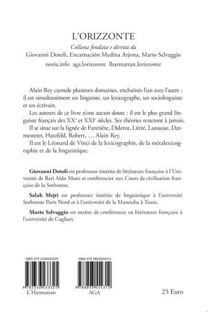 Alain Rey est contraire aux complications des linguistes. Pour lui, le domaine de la lexicographie est clair. Il ne veut même pas se définir comme un lexicographe. Il affirme : « Lorsqu’on me demande mon métier, j’évite même ‘lexicographe’ et je dis en français : ‘je fais des dicos’, pensant être en tout cas compris’ ». Il ajoute : « Toujours est-il que j’évitais, évite et éviterai lexicographe, lorsqu’on s’enquiert (ou s’enquerra), même avec bienveillance, de mes activités. ‘Faiseur de dictionnaires’ est clair, et honorable, mais pesant ; ‘dictionnairiste’, je le trouve pédant, surtout lorsqu’on s’en sert pour opposer à la noble lexicographie, qui se charge des tâches intellectuelles (un art libéral, eût-on dit autrefois), la servile dictionnairique, pourtant dynamisée par sa finale qui lui permet d’accéder au firmament de l’informatique, mais qui n’inclurait, pensent de trop subtils universitaires, que les tâches matérielles de la réalisation du livre, ce que j’appelle moins savamment l’‘édition de dictionnaires’. Mais la distance que je prends vis-à-vis du terme de lexicographe est surtout de politesse, tant je me défie des trop gros mots ». […]. La conclusion d’Alain Rey est fantastique : « On recherche le lexicographe pur : on ne le trouvera pas plus que le pur dictionnaire ». Comment définir alors le dictionnaire ? Alain Rey essaie d’être précis : « Le dictionnaire est un objet spécifique, textuel, métalinguistique, culturel ». Mais face à cette simplicité, il y a le mystère, le grand mystère de la langue. Dans son Dictionnaire culturel en langue française, il parle de : « Recueil d’unités signifiantes d’une langue ou de plusieurs langues confrontées (mots, termes, locutions, éléments) rangés dans un ordre convenu, qui donne des définitions et diverses informations sur les signes du langage ; ouvrage réunissant ces informations ». Et encore : « La fonction de tout dictionnaire est, en partant d’un ensemble de discours homogènes et en sélectionnant des éléments et des relations, de produire une liste cohérente de signes isolables appartenant à une ou plusieurs langues mises en rapport ». GIOVANNI DOTOLI Alain Rey cumule plusieurs domaines, enchaînés l’un avec l’autre : il est simultanément un linguiste, un lexicographe, un sociolinguiste et un écrivain. Les auteurs de ce livre n’ont aucun doute : il est le plus grand linguiste français des XXe et XXIe siècles. Ses théories resteront à jamais. Il se situe sur la lignée de Furetière, Diderot, Littré, Larousse, Darmesteter, Hatzfeld, Robert, … Alain Rey. Il est le Léonard de Vinci de la lexicographie, de la métalexicographie et de la linguistique.