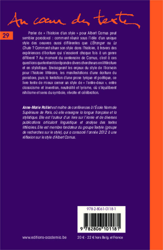 Comment réunir sous l'idée d'un unique style des uvres aussi différentes que L'Étranger ou La Chute ? Comment situer le style de Camus dans l'histoire, à partir d'expériences qui s'essaient toutes à un genre différent ? Au moment du centenaire de l'auteur, c'est à ces questions que l'on voudrait répondre, pour mieux cerner un style de « l'entre-deux », entre classicisme et invention, nihilisme et sens du symbole, entre écriture blanche et lyrisme, révolte et célébration.