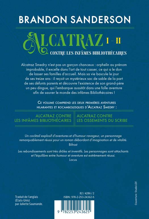 Alcatraz Smedry n’est pas un garçon chanceux : orphelin au prénom improbable, il excelle dans l’art de tout casser, ce qui a le don de lasser ses familles d’accueil. Mais sa vie bascule le jour de ses treize ans : il reçoit un mystérieux sac de sable de la part de ses défunts parents et découvre l’existence de son grand-père un peu dingue, qui l’embarque aussitôt dans une folle aventure afin de sauver le monde des infâmes Bibliothécaires !