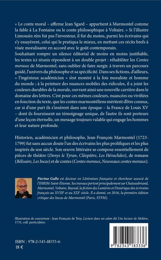 du monde ; à la peinture des nuances mobiles des ridicules, il a joint les couleurs durables de la morale, ouvrant ainsi une nouvelle carrière dans le domaine des lettres. C'est pour ces mêmes couleurs, nuancées ou vivifiées en fonction du texte, que les contes marmontéliens méritent d'être connus, car si d'une part ils s'insèrent dans une époque – la France de Louis XV – dont ils fournissent un témoignage unique, de l'autre ils sont porteurs d'une leçon éternelle, un message toujours valable qui engage les hommes et leur nature profonde.