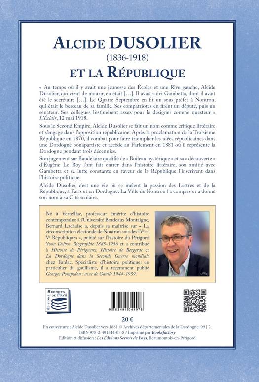 Sous le Second Empire, Alcide Dusolier se fait un nom comme critique littéraire et s’engage dans l’opposition républicaine. Après la proclamation de la Troisième République en 1870, il combat pour faire triompher les idées républicaines dans une Dordogne bonapartiste et accède au Parlement en 1881 où il représente la Dordogne pendant trois décennies. Son jugement sur Baudelaire, qualifié de « Boileau hystérique » et sa « découverte » d’Eugène Le Roy (l'auteur de « Jacquou le Croquant » l’ont fait entrer dans l’histoire littéraire ; son amitié avec Gambetta et sa lutte constante en faveur de la République l’inscrivent dans l’histoire politique. À l’occasion du cent-cinquantenaire de la République, c’est autour du rôle et de la place d’Alcide Dusolier dans l’histoire de la République que ce livre est construit, en trois parties : un homme de lettres engagé à Paris dans le combat pour la République (1836-1870), avec Gambetta pour installer la République en Dordogne (1870-1881), le parlementaire, un des piliers de la République en Dordogne (1881-1918). Alcide Dusolier, c’est une vie où se mêlent la passion des Lettres et de la République, à Paris et en Dordogne. Bernard Lachaise est agrégé d’histoire, professeur émérite d’histoire contemporaine à l’Université Bordeaux Montaigne. Il est l'auteur de nombreuses publications dont : Yvon Delbos. Biographie 1885-1956 (1993), une collaboration à Histoire de Périgueux (2010), à Histoire de Bergerac (2017) et la co-direction de La Dordogne dans la Seconde Guerre mondiale (2020). Spécialiste d’histoire politique, en particulier du gaullisme, il a récemment publié Georges Pompidou : avec de Gaulle 1944-1959 (2020).