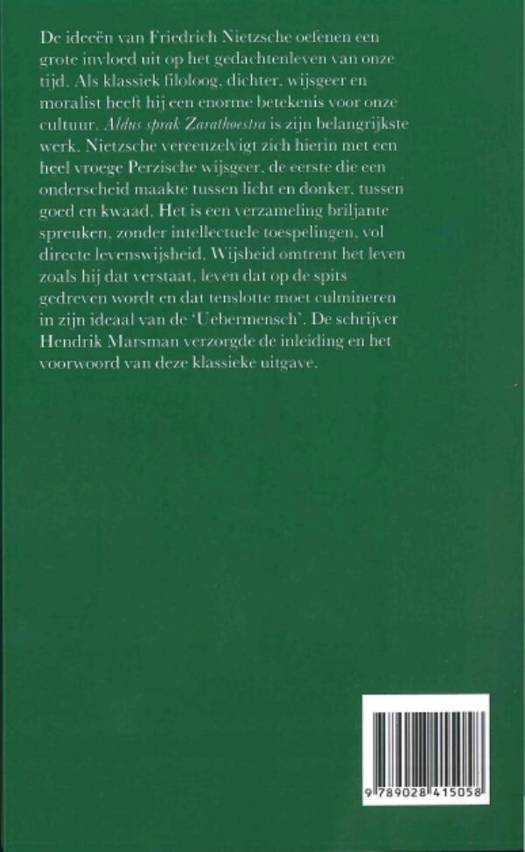 Van alle boeken van Nietzsche is Aldus sprak Zarathoestra het meest opmerkelijk. In dit boek presenteert hij zijn ideaal van de mens, een wezen dat bevrijd is van egoïsme en geen God en geloof meer nodig heeft om volmaakt gelukkig te zijn: de 'Übermensch'. De ideeën van Friedrich Nietzsche oefenen een grote invloed uit op het gedachtenleven van onze tijd. Als klassiek filoloog, dichter, wijsgeer en moralist heeft hij een enorme betekenis voor onze cultuur.