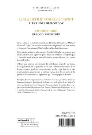 Féroce satire de la société moscovite du début du XIXe siècle, Le Malheur d’avoir de l’esprit eut un retentissement exceptionnel en son temps et demeure l’une des comédies les plus drôles du théâtre russe. Deux siècles après son achèvement, Rodolphe Baudin en propose une étude détaillée, qui replace la pièce dans son contexte sociopolitique et littéraire, et en résume les meilleures lectures critiques, tant russes qu’occidentales. Offrant une analyse approfondie des spécificités formelles du texte, mais également de sa postérité et de son influence ultérieure, il en donne en outre plusieurs interprétations inédites, qui font écho aux interrogations actuelles sur la culture russe, dans le contexte de la guerre en Ukraine et de la répression qui l’accompagne en Russie.