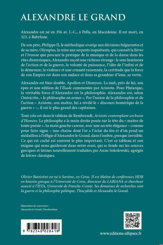 Alexandre est bien double, Apollon et Dionysos. La nuit, près de lui, son épée et une édition de l’Iliade commentée par Aristote. Pour Plutarque, la véritable force d’Alexandre est la philosophie. Alexandre est, selon Onésicrite, « le philosophe en armes ». Par l’union de la philosophie et de l’action – Aristote, son maître, lui a révélé le « discours homérique de la guerre » –, il est le plus grand des capitaines.