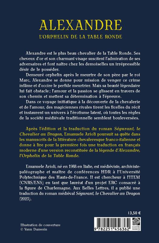 Après l’édition et la traduction du roman Ségurant, le Chevalier au Dragon, Emanuele Arioli poursuit sa quête dans les manuscrits de la littérature chevaleresque franco-italienne et donne à lire pour la première fois une traduction en français moderne d’une version reconstituée de la légende d’Alexandre, l’Orphelin de la Table Ronde.