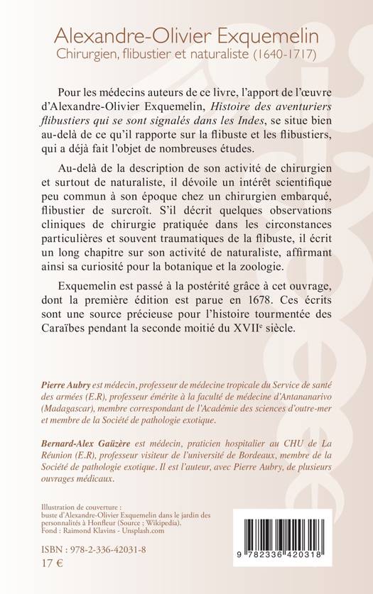 Pour les médecins auteurs de ce livre, l’apport de l’œuvre d’Alexandre-Olivier Exquemelin, Histoire des aventuriers flibustiers qui se sont signalés dans les Indes, se situe bien au-delà de ce qu’il rapporte sur la flibuste et les flibustiers, qui a déjà fait l’objet de nombreuses études. Au-delà de la description de son activité de chirurgien et surtout de naturaliste, il dévoile un intérêt scientifique peu commun à son époque chez un chirurgien embarqué, flibustier de surcroît. S’il décrit quelques observations cliniques de chirurgie pratiquée dans les circonstances particulières et souvent traumatiques de la flibuste, il écrit un long chapitre sur son activité de naturaliste, affirmant ainsi sa curiosité pour la botanique et la zoologie. Exquemelin est passé à la postérité grâce à cet ouvrage, dont la première édition est parue en 1678. Ces écrits sont une source précieuse pour l’histoire tourmentée des Caraïbes pendant la seconde moitié du XVIIe siècle.