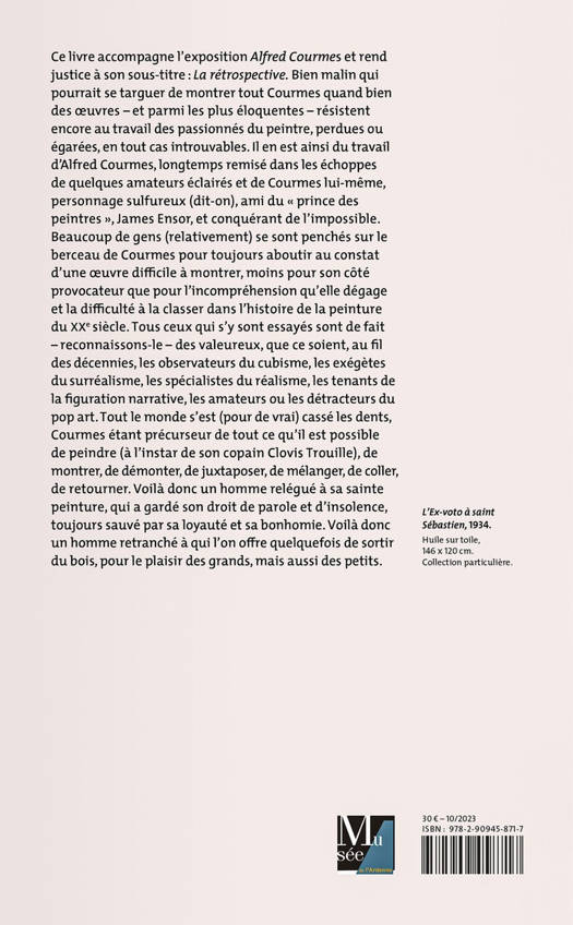 C’est dire que l’œuvre de Courmes a émerveillé tout le siècle, à preuve sa présence dans les plus grands musées français, depuis le centre Pompidou jusqu’au musée d’Art moderne de la ville de Paris. Courmes aura peu connu les honneurs sinon celui de dresser le portrait de Jack Lang en 1991. Il aura côtoyé tout le XXe siècle en qualité de peintre insolent et utilement provocateur et trouvé ses meilleurs amis dans le cercle restreint des grands acteurs du surréalisme et des maîtres du calembour graphique. En France?: Clovis Trouille et Gaston Chaissac?; en Belgique?: James Ensor et Félix Labisse. Au fil des ans et au hasard des rencontres, il aura stupéfié aussi bien les peintres de la Figuration narrative (Aillaud, Arroyo, etc.) que les membres du groupe Panique (Olivier O. Olivier, Roland Topor, etc.). Alfred Courmes est aussi un amoureux de Paris (particulièrement le canal Saint-Martin qui lui sert de décor), se suffisant de ses après-midis de travail dans son appartement de la rue des Écluses Saint-Martin qu’il rejoignait après son travail de nuit aux grands magasins de La Samaritaine. C’est aussi un érudit de l’histoire de la mythologie, un féru de l’histoire des sciences, un soupçonneux de l’histoire des religions, et encore plus des désastres de la guerre. Un enchanteur du désir, bien sûr. Et, point d’orgue de cette œuvre, son appétence pour les images publicitaires qui en font assurément le pionnier du pop’art européen et américain.