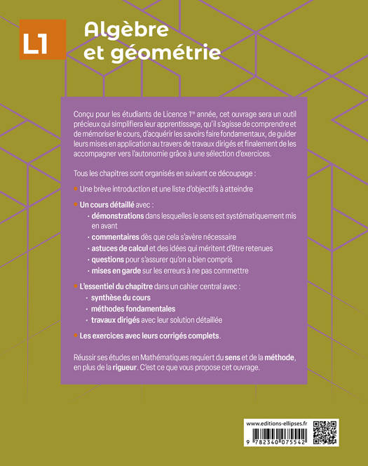 Conçu pour les étudiants de Licence 1re année, cet ouvrage sera un outil précieux qui simplifiera leur apprentissage, qu’il s’agisse de comprendre et de mémoriser le cours, d’acquérir les savoirs faire fondamentaux, de guider leurs mises en application au travers de travaux dirigés et finalement de les accompagner vers l’autonomie grâce à une sélection d’exercices.