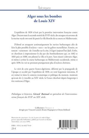 L'expédition de 1830 n'était pas la première intervention française contre Alger. Durant toute la seconde moitié du XVIIe siècle, des attaques récurrentes de la marine royale ont tenté de punir la ville blanche de sa course en Méditerranée. D'abord en attaquant systématiquement les navires barbaresques afin de faire le plus possible d'esclaves « turcs » sur les galères marseillaises. Ensuite, en tentant - vainement - de s'installer sur la côte, à Gigeri (aujourd'hui Jijel). Enfin, en cherchant à impressionner le dey par des bombardements qui, en 1682 et 1683 puis en 1688, ont pilonné la ville et le port. Sans réussir à détruire Alger, ni même à arrêter la course barbaresque en Méditerranée occidentale, même si après 1690, les raïs ne prennent pratiquement plus d'esclaves chrétiens. Le récit de cette guerre franco-algérienne, déformé par la propagande de l'époque et occulté par l'expédition de 1830, est resté largement méconnu. Il est resitué ici dans le contexte économique et politique du moment, montrant qu'avant de s'y installer au XIXe siècle, la France cherchait depuis longtemps à être maîtresse d'Alger.