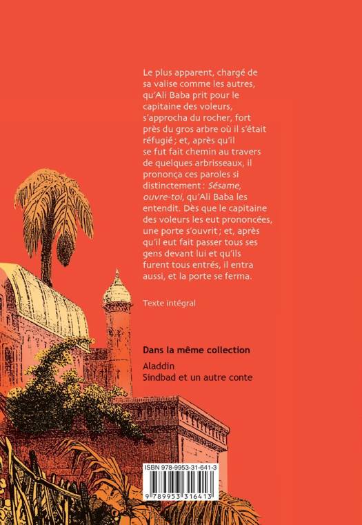 3 contes. Histoire d'Ali Baba et des quarante voleurs exterminés par une esclave. Histoire d'Ali Cogia marchand de Bagdad. Histoire du cheval enchanté. Le plus apparent, chargé de sa valise comme les autres, qu'Ali Baba prit pour le capitaine des voleurs, s'approcha du rocher, fort près du gros arbre où il s'était réfugié ; et, après qu'il se fut fait chemin au travers de quelques arbrisseaux, il prononça ces paroles si distinctement : « Sésame, ouvre-toi », qu'Ali Baba les entendit