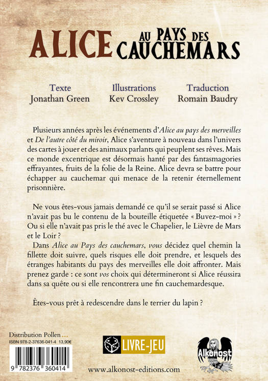 Plusieurs années après les événements d'Alice au Pays des merveilles et De l'autre Côté du miroir, Alice emprunte encore une fois le terrier, appelée à sauver le monde des cartes et animaux parlants de la folie croissante de la reine. Mais tant d'illusions hantent ce monde fantasque et incertain! Bien vite, Alice devra se battre pour s'échapper du cauchemar qui menace le royaume. Ne vous êtes-vous jamais demandé ce qu'il se serait passé si Alice n'avait pas bu le contenu de la bouteille étiquetée « Buvez-moi » ? Ou si elle n'avait pas pris le thé avec le Chapelier, le Lièvre de Mars et le Loir? Vous pouvez désormais le découvrir. Dans Alice au Pays des cauchemars, vous décidez quel chemin la fillette doit suivre, quels risques elle doit prendre, et lesquels des étranges habitants du pays des merveilles elle doit affronter. Mais prenez garde : ce sont vos choix qui détermineront si Alice réussira dans sa quête ou si elle rencontrera une fin cauchemardesque.