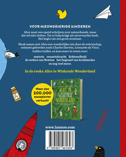 Maak samen met Alice een wonderlijke reis door de wetenschap, ontmoet geleerden zoals Charles Darwin, Leonardo da Vinci, Galileo Galilei, en kom meer te weten over: