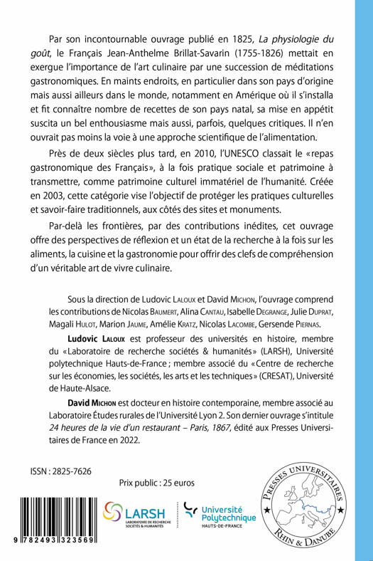 Par son incontournable ouvrage publié en 1825, La physiologie du goût, le Français Jean-Anthelme Brillat-Savarin (1755-1826) mettait en exergue l’importance de l’art culinaire par une succession de méditations gastronomiques. En maints endroits, en particulier dans son pays d’origine mais aussi ailleurs dans le monde, notamment en Amérique où il s’installa et fit connaître nombre de recettes de son pays natal, sa mise en appétit suscita un bel enthousiasme mais aussi, parfois, quelques critiques. Il n’en ouvrait pas moins la voie à une approche scientifique de l’alimentation. Près de deux siècles plus tard, en 2010, l’UNESCO classait le « repas gastronomique des Français », à la fois pratique sociale et patrimoine à transmettre, comme patrimoine culturel immatériel de l’humanité. Créée en 2003, cette catégorie vise l’objectif de protéger les pratiques culturelles et savoir-faire traditionnels, aux côtés des sites et monuments. Par-delà les frontières, par des contributions inédites, cet ouvrage offre des perspectives de réflexion et un état de la recherche à la fois sur les aliments, la cuisine et la gastronomie pour offrir des clefs de compréhension d’un véritable art de vivre culinaire.
