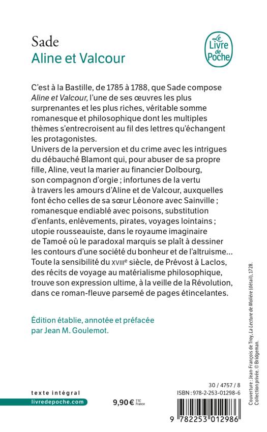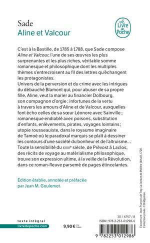C'est à la Bastille, de 1785 à 1788, que Sade compose Aline et Valcour, l'une de ses oeuvres les plus surprenantes et les plus riches, véritable somme romanesque et philosophique dont les multiples thèmes s'entrecroisent au fil des lettres qu'échangent les protagonistes.