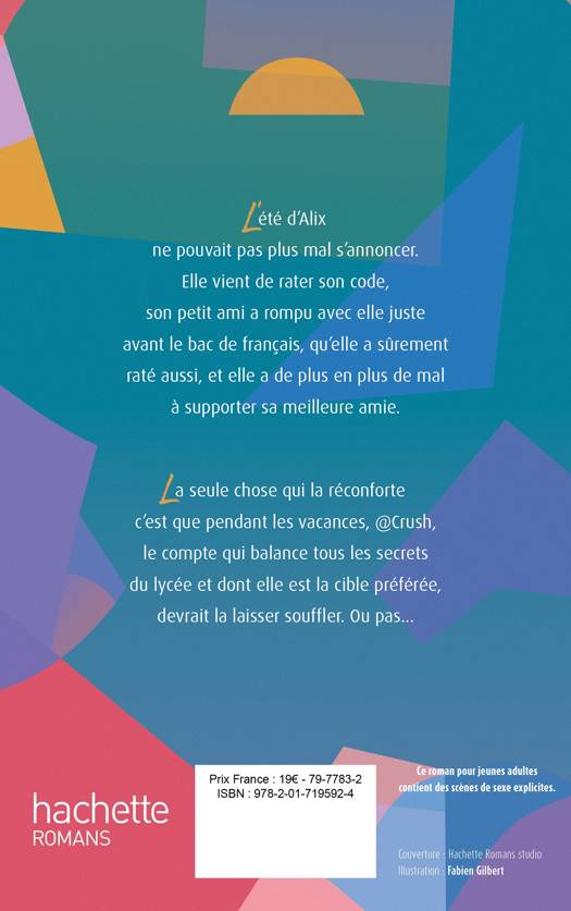 L’été d’Alix ne pouvait pas plus mal s’annoncer. Elle vient de rater son code, son petit ami a rompu avec elle juste avant le bac de français, qu’elle a sûrement raté aussi, et elle a de plus en plus de mal à supporter sa meilleure amie. La seule chose qui la réconforte c’est que pendant les vacances, @Crush, le compte qui balance tous les secrets du lycée et dont elle est la cible préférée, devrait la laisser souffler. Ou pas...