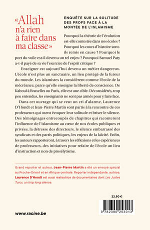 Dans cet ouvrage qui se veut un cri d'alarme, Laurence D'Hondt et Jean-Pierre Martin sont partis à la rencontre de ces professeurs qui osent évoquer leur solitude et briser le silence. Des témoignages entrecoupés de chapitres qui raconteront l'influence de l'islamisme au cœur de nos écoles publiques et privées, la détresse des directeurs, le silence embarrassé des syndicats et des partis politiques, les enjeux de la laïcité. Enfin, les auteurs rapporteront, à travers les réflexions et les expériences de professeurs, des initiatives pour refaire de l'école un lieu d'instruction et non de prosélytisme.