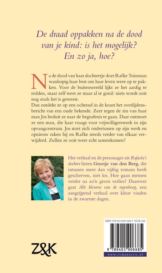 Alle kleuren van de regenboog van Greetje van den Berg is het vervolg op de roman Rafaela's dochter. Na de dood van haar dochtertje doet Rafke Tuinman wanhopig haar best om haar leven weer op te pakken. Ze gaat terug aan het werk en samen met haar man Jos en zoontje Matthijs besluit ze te verhuizen. Voor de buitenwereld lijkt ze het aardig te redden, maar niets wordt ooit nog hetzelfde. Alle kleuren van de regenboog is een aangrijpende roman over kleur vinden in de zwartste dagen.