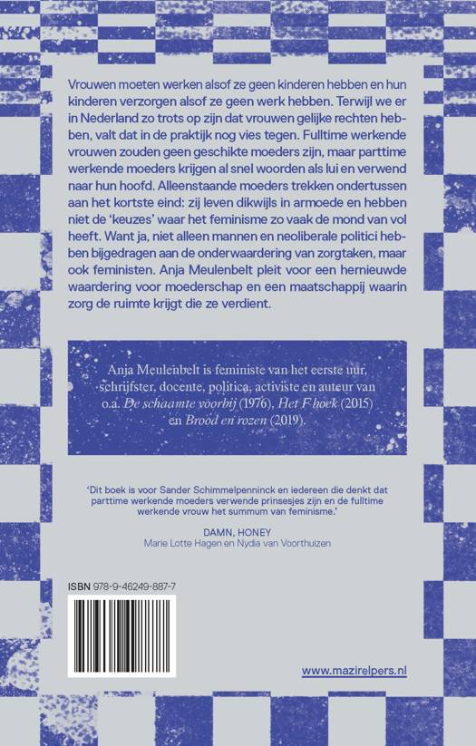 Vrouwen moeten werken alsof ze geen kinderen hebben en hun kinderen verzorgen alsof ze geen werk hebben. Terwijl we er in Nederland zo trots op zijn dat vrouwen gelijke rechten hebben, valt dat in de praktijk nog vies tegen. Fulltime werkende vrouwen zouden geen geschikte moeders zijn, maar parttime werkende moeders krijgen al snel woorden als lui en verwend naar hun hoofd. Alleenstaande moeders trekken ondertussen aan het kortste eind: zij leven dikwijls in armoede en hebben niet de ‘keuzes’ waar het feminisme zo vaak de mond van vol heeft. Want ja, niet alleen mannen en neoliberale politici hebben bijgedragen aan de onderwaardering van zorgtaken, maar ook feministen. Anja Meulenbelt pleit voor een hernieuwde waardering voor moederschap en een maatschappij waarin zorg de ruimte krijgt die ze verdient.