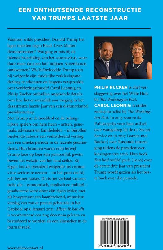 In 'Alleen ik kan dit' onthullen Carol Leonnig en Philip Rucker ongekende details over hoe het er werkelijk aan toeging in het desastreuze laatste jaar van een disfunctioneel presidentschap. Met Trump in de hoofdrol en de belangrijkste spelers om hem heen – artsen, generaals, adviseurs en familieleden – in bijrollen bieden de auteurs een verhelderend verslag van een unieke periode in de recente geschiedenis. Hun bronnen waren erbij terwijl Trump keer op keer zijn persoonlijk gewin boven het welzijn van het land stelde. Zij zagen hoe de president weigerde het coronavirus serieus te nemen – tot het punt dat hij zelf besmet raakte. Dit is het verhaal van een natie die – economisch, medisch en politiek – gesaboteerd werd door zijn eigen leider, met als hoogtepunt een baanbrekend, minutieus verslag van wat er precies gebeurde in het Capitool op 6 januari 2021. Alleen ik kan dit is voorbestemd om nog decennia gelezen en bestudeerd te worden als een klassieker in de journalistiek.