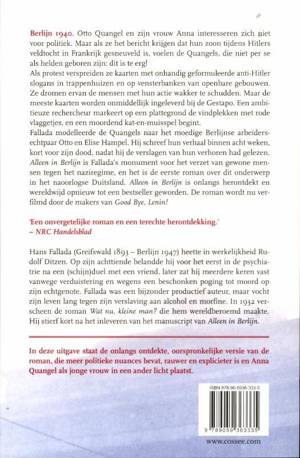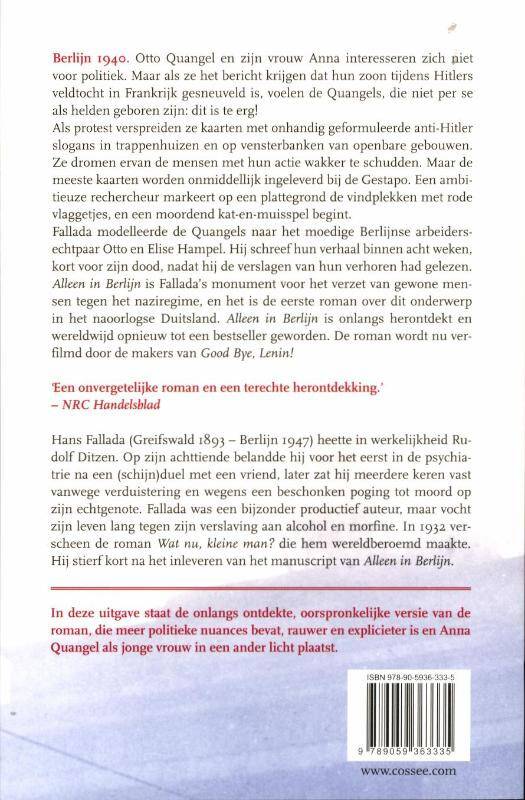 Van Hans Fallada’s meesterwerk Alleen in Berlijn is in de kelder van de oorspronkelijke uitgever een versie gevonden die op het gebied van vloeken en seks minder kuis is. Bovendien bleken in hoofdstuk zeventien enkele pagina’s over Anna Quangels nazi-verleden te zijn gesneuveld in de editie die inmiddels wereldwijd is vertaald. De toenmalige uitgeverij Aufbau had in 1947 ten doel de democratische opvoeding van het Duitse volk onder Russisch toezicht te ondersteunen. Blijkbaar moest de roman destijds meer humanistisch opbouwend zijn. Een overtuigd nazi als hoofdpersoon, dat was te veel van het goede. Wij weten niet of Hans Fallada deze redactie van zijn roman zou hebben goedgekeurd. Hij overleed kort na de inlevering van het manuscript. Het is wel voorstelbaar dat hij met de gepubliceerde versie ingestemd zou hebben, omdat hij de cultuurpolitieke doelstelling van Aufbau onderschreef. Deze midprice editie heeft dus een dubbel voordeel voor de lezers: een goedkope editie en, voor het eerst, de ‘onbewerkte’ originele versie, zoals Fallada zijn manuscript inleverde.