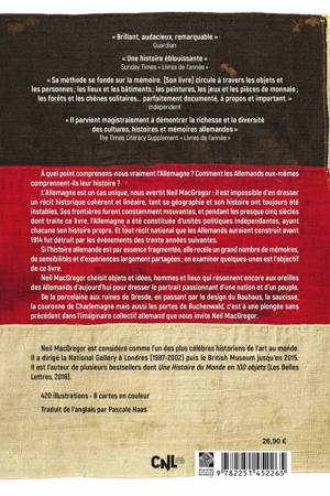 A quel point comprenons-nous vraiment l'Allemagne ? Comment les Allemands eux-memes comprennent-ils leur histoire ? L'Allemagne est un cas unique, nous avertit Neil MacGregor: il est impossible d'en dresser un recit historique coherent et lineaire, tant sa geographie et son histoire ont toujours ete instables. Ses frontieres furent constamment mouvantes, et pendant les presque cinq siecles dont traite ce livre, l'Allemagne a ete constituee d'unites politiques independantes, ayant chacune son histoire propre. Et tout recit national que les Allemands auraient construit avant 1914 fut detruit par les evenements des trente annees suivantes. Si l'histoire allemande est par essence fragmentee, elle recele un grand nombre de memoires, de sensibilites et d'experiences largement partagees; en examiner quelques-unes est l'objectif de ce livre. Neil MacGregor choisit objets et idees, hommes et lieux qui resonnent encore aux oreilles des Allemands d'aujourd'hui pour dresser le portrait passionnant d'une nation et d'un peuple. De la porcelaine aux ruines de Dresde, en passant par le design du Bauhaus, la saucisse, la couronne de Charlemagne mais aussi les portes de Buchenwald, c'est a une plongee sans precedent dans l'imaginaire collectif allemand que nous invite Neil MacGregor.