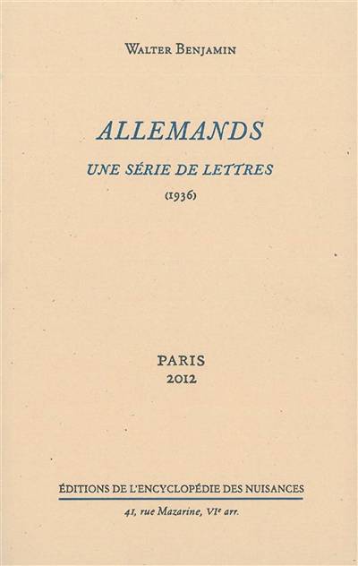 En 1936, Walter Benjamin regroupe sous le titre "Allemands" vingt-cinq lettres tirées de correspondances du XIXème siècle allemand (de Lichtenberg à Nietzsche, des noms moins fameux y côtoient ceux de Goethe, Kant, Büchner et les frères Grimm, Hölderlin et Metternich), chacune précédée d'une brève introduction. Publié en Suisse sous un pseudonyme, le livre était destiné à passer dans l'Allemagne du IIIème Reich. Walter Benjamin espérait encore contribuer ainsi, si peu que ce fût, à sauver de l'anéantissement ce qui pouvait y subsister de l'esprit des Lumières, "comme un recours contre l'accélération catastrophique de l'histoire", selon la formule de Theodor Adorno.