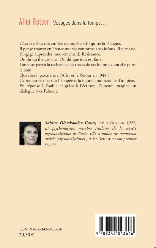 Sabine Olewkowiez Cann part à la recherche des traces de cet homme dont elle porte le nom. Que s'est-il passé entre l'Aller et le Retour en 1944 ? Ce récit romancé reconstruit l'épopée et la figure fantomatique d'un père. En réponse à l'oubli, et grâce à l'écriture, l'auteure imagine un dialogue avec l'absent.
