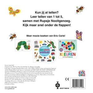 Het kartonboekje 'Allereerste cijfers met Rupsje Nooitgenoeg' is de perfecte eerste kennismaking met cijfers en tellen voor kinderen vanaf 2 jaar. Iedere pagina bevat een grote, stevige flap van karton met daarin een doorkijkje om alvast te spieken wat erachter verstopt zit. Kinderen kunnen meetellen met één Rupsje Nooitgenoeg, twee springende kikkers, drie zwemmende vissen, vier zoemende bijen en vijf fladderende vlinders.