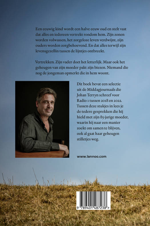 Een eeuwig kind wordt een halve eeuw oud en stelt vast dat alles en iedereen vertrekt rondom hem. Zijn zonen worden volwassen, het zorgeloze leven verdwijnt, zijn ouders worden zorgbehoevend. En dat alles terwijl zijn levensgezellin tussen de lijntjes ontbreekt. Vertrekken. Zijn vader doet het letterlijk. Maar ook het geheugen van zijn moeder pakt zijn biezen. Niemand die nog de jongeman opmerkt die in hem woont. Dit boek bevat een selectie uit de Middagjournaals die Johan Terryn schreef voor Radio 1 tussen 2018 en 2022. Tussen deze stukjes in lees je de tedere gesprekken die hij hield met zijn 85-jarige moeder, waarin hij naar een manier zoekt om samen te blijven, ook al gaat haar geheugen stilletjes weg.