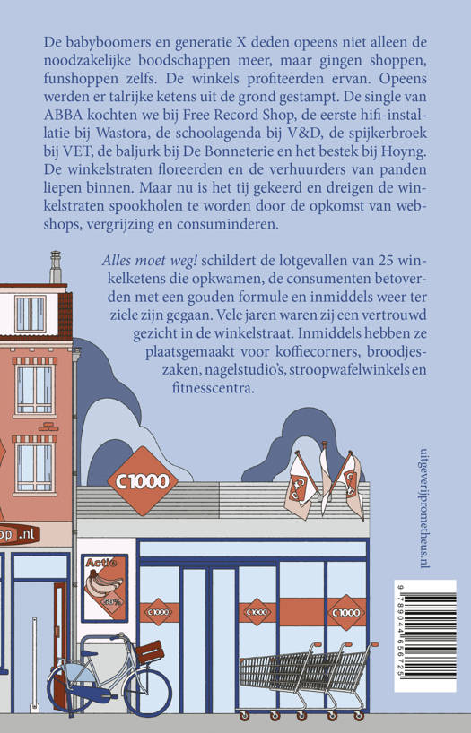 De babyboomers en generatie X deden opeens niet alleen de noodzakelijke boodschappen meer, maar gingen shoppen, funshoppen zelfs. De winkels profiteerden ervan. Opeens werden er talrijke ketens uit de grond gestampt. De single van ABBA en de cd van Dire Straits kochten we bij Free Record Shop, de eerste hifi-installatie bij Wastora of Harense Smid, de schoolagenda bij V&D, de spijkerbroek bij VET, het eerste communiepakje bij Kreymborg, de plussize kleding bij Miss Etam, de baljurk bij De Bonneterie en het bestek bij Hoyng. De Gruyter had zijn gratis snoepje van de week en C1000 zijn formule. De winkelstraten floreerden en de verhuurders van panden liepen binnen. Maar nu is het tij gekeerd en dreigen de winkelstraten spookholen te worden door de opkomst van webshops, vergrijzing en consuminderen. Alles moet weg! schildert de lotgevallen van 25 winkelketens die opkwamen, de consumenten betoverden met een gouden formule en inmiddels weer ter ziele zijn gegaan. Vele jaren waren zij een vertrouwd gezicht in de winkelstraat. Inmiddels hebben ze plaatsgemaakt voor koffiecorners, broodjeszaken, nagelstudio’s, stroopwafelwinkels en fitnesscentra.