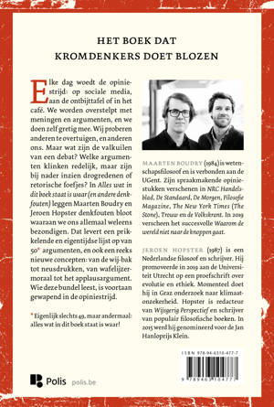 In Alles wat in dit boek staat is waar (en andere denkfouten) leggen Maarten Boudry en Jeroen Hopster denkfouten bloot waaraan we ons allemaal weleens bezondigen. Dat levert verfrissende analyses en prikkelende inzichten op. En ook een reeks nieuwe concepten: van de wij-bak tot neusdrukken, van wafelijzermoraal tot het applausargument. Wie deze fijne selectie van denkfouten tot zich neemt, is een stuk beter gewapend in de moderne opinieoorlog.