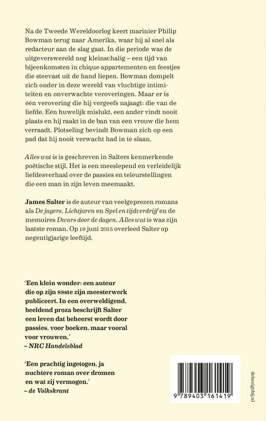 Alles wat is is geschreven in Salters kenmerkende poëtische stijl. Het is een meeslepend en verleidelijk liefdesverhaal over de passies en teleurstellingen die een man in zijn leven meemaakt.