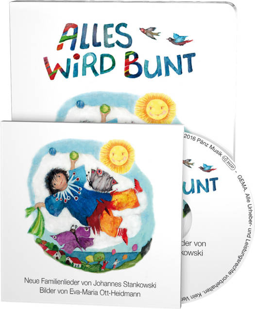 Die Erde färbt sich und trägt jetzt ihr buntes Kleid. Zeit für einen gemütlichen Muckeltag im Schlafanzug oder eine Entdeckungsreise zu den Tieren in der Stadt. Eva-Maria Ott-Heidmann hat das bunte Mitsing-Bilderbuch zu den neuen Familien-Songs von Johannes Stankowski gestaltet.Die Lieder im Buch und auf der CD:1. Überall auf der Erde 2. Ich fliege 3. Alles braucht Zeit 4. Tiere einer Stadt 5. Der schönste Ball im All 6. Muckeltag 7. Wärst du nicht auf dieser Welt 8. Im Herbst 9. Ins Schwimmbad 10. Ein letztes Lied""Alles wird BUNT" heißt die nagelneue CD von Johannes Stankowski. Wie auf seinem letzten Album hat er sich dafür richtig tolle Kinderlieder ausgedacht, die sogar euren Eltern gefallen werden. Alle Lieder haben einen schlauen Text und die Instrumente spielen überraschende Akkorde und Melodien. Viele Kinder haben bei der Aufnahme mitgesungen. Es gibt ein Geburtstagslied, ein Kuschellied, ein Herbstlied und viele andere Geschichten. Mit der CD kommt ein tolles Bilderbuch." WDR KiRaKa"Cremig flockende, satt produzierte Nummern ... Texte, die erneut thematisch sauber geordnet die gesamte Welt des kindlichen Erlebens durchgrasen." StadtRevue"Mit seiner zweiten CD "Alles wird BUNT" setzt Stankowski sogar noch einen drauf: Organisch und satt strahlt die Musik, die Texte transportieren leichtfüßig Alltagsthemen aus der kindlichen Lebenswelt und geben zwischen den Zeilen zu denken." Deutscher Familienverband