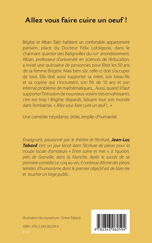 Brigitte et Alban Tatin habitent un confortable appartement parisien, place du Docteur Félix Lobligeois, dans le charmant quartier des Batignolles du XVIIème arrondissement. Alban, professeur d'université en sciences de l'éducation, a invité une quinzaine de personnes pour fêter les 50 ans de sa femme Brigitte. Mais bien sûr, celle-ci doit s'occuper de tout. Elle doit aussi supporter sa mère, son beau-fils et sa copine qui s'incrustent, son fils de 10 ans et son infernal problème de mathématiques... Aussi, quand il faut supporter l'intrusion de nouveaux voisins très envahissants, c'en est trop ! Brigitte disparaît, laissant tout son monde dans l'embarras. " Allez-vous faire cuire un œuf ! ..."