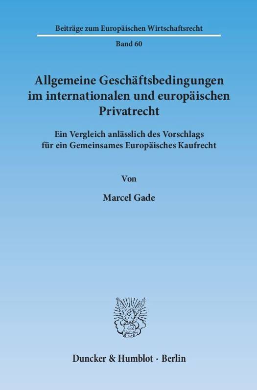 Marcel Gade vergleicht die AGB-Vorschriften des BGB und des UN-Kaufrechts (CISG) mit denen der nichtstaatlichen Regelwerke der UNIDROIT-Principles (PICC), Principles of European Contract Law (PECL), dem Draft Common Frame of Reference (DCFR) sowie dem von der EU-Kommission vorgelegten Vorschlag für ein Gemeinsames Europäisches Kaufrecht und seinem »Vorentwurf«, der Machbarkeitsstudie zur Einführung eines Europäischen Vertragsrechts.