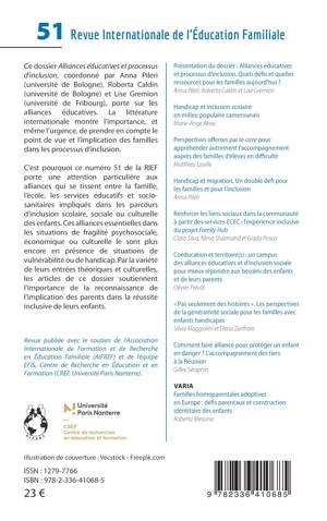 Ce numéro 51 de la RIEF porte une attention particulière aux alliances qui se tissent entre la famille, l’école, les services éducatifs et sociosanitaires impliqués dans les parcours d’inclusion scolaire, sociale ou culturelle des enfants. Ces alliances essentielles dans les situations de fragilité psychosociale, économique ou culturelle le sont plus encore en présence de situations de vulnérabilité ou de handicap. Par la variété de leurs entrées théoriques et culturelles, les articles de ce dossier soutiennent l’importance de la reconnaissance de l’implication des parents dans la réussite inclusive de leurs enfants.