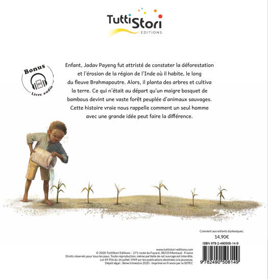 Etant jeune, Jadav Payeng fut attristé de constater la déforestation et l'érosion de la région de l'Inde où il habite, le long du fleuve Brahmapoutre. Alors, il planta des arbres et cultiva la terre. Ce qui n'était au départ qu'un maigre bosquet de bambous devint une vaste forêt peuplée d'animaux sauvages. Cette histoire vraie nous rappelle comment un seul homme avec une grande idée peut faire la différence