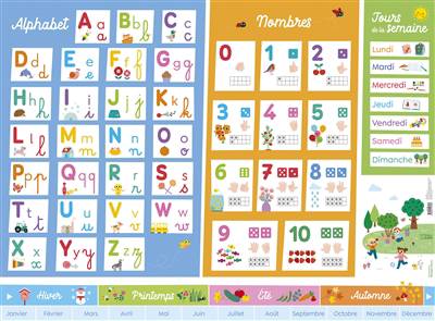 Les 26 lettres de l'alphabet, les nombres de un à dix et les jours de la semaine sont représentés avec, pour chaque élément, une illustration. Une partie permet à l'enfant de s'entraîner à écrire et des mémos rappellent certaines notions.