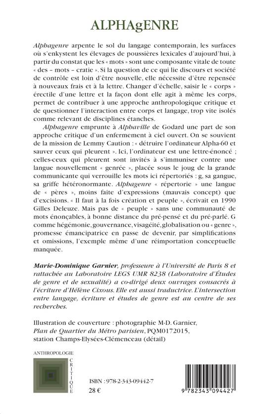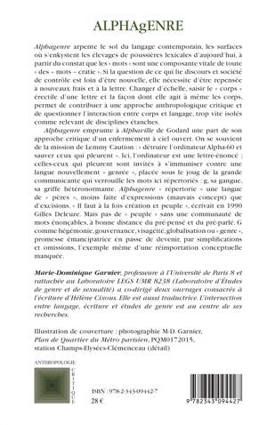 ALPHAgENRE : ou comment lire avec les doigts. Les mots recueillis dans ce dictionnaire tactile de la langue contemporaine ont en commun de relayer le pouvoir de sexuation graphique, les effets de gangue et de gang d'une lettre phallique, micro-organe érectile de pouvoir : G ou g. De "genre" à "gouvernance", de "jungle" à "migrant" ou "hégémonie", cet essai analyse le régime graphique d'une lettre-corps, courroie de transmission d'une machine à binariser, à normer, à pré-former, à soumettre.