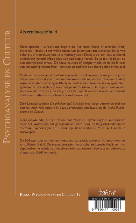 Deze essaybundel, Als een tweede huid. Mode en Psychoanalyse is geïnspireerd door het symposium dat georganiseerd werd door de Belgisch-Nederlandse Stichting Psychoanalyse en Cultuur op 30 november 2024 in De Cinema in Antwerpen.