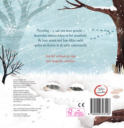 Plotseling – o, wat een mooi gezicht – dwarrelen sneeuwvlokjes in het maanlicht.