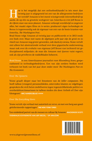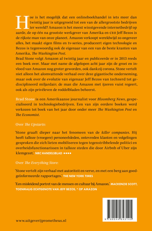 Brad Stone volgt Amazon al twintig jaar en publiceerde er in 2013 al een boek over. Maar met name de afgelopen acht jaar zijn de groei en invloed van Amazon nog groter geworden, ook dankzij corona. Stone vertelt niet alleen het alomvattende verhaal over deze gigantische onderneming, maar ook over de evolutie van eigenaar Jeff Bezos van technerd tot gedisciplineerd miljardair; de man die Amazon met ijzeren vuist regeert, ook als zijn privéleven de roddelbladen beheerst.
