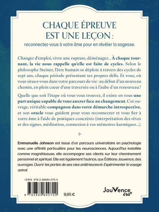 Quelle que soit l’étape où vous vous trouvez, il existe en vous une part unique capable de vous ancrer face au changement. Cet ouvrage, véritable compagnon dans votre démarche introspective, et son oracle vous guident pour vous reconnecter et vous fier à votre âme à l’aide de pratiques concrètes (interprétation des rêves et des signes, méditation, connexion à vos mémoires karmiques...).