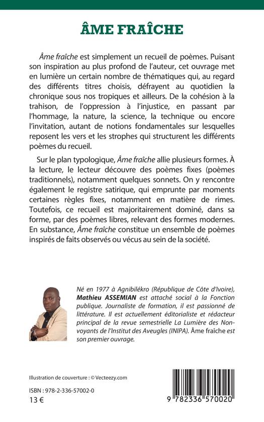 Âme fraîche est simplement un recueil de poèmes. Puisant son inspiration au plus profond de l'auteur, cet ouvrage met en lumière un certain nombre de thématiques qui, au regard des différents titres choisis, défrayent au quotidien la chronique sous nos tropiques et ailleurs. De la cohésion à la trahison, de l'oppression à l'injustice, en passant par l'hommage, la nature, la science, la technique ou encore l'invitation, autant de notions fondamentales sur lesquelles reposent les vers et les strophes qui structurent les différents poèmes du recueil. Sur le plan typologique, Âme fraîche allie plusieurs formes. À la lecture, le lecteur découvre des poèmes fixes (poèmes traditionnels), notamment quelques sonnets. On y rencontre également le registre satirique, qui emprunte par moments certaines règles fixes, notamment en matière de rimes. Toutefois, ce recueil est majoritairement dominé, dans sa forme, par des poèmes libres, relevant des formes modernes. En substance, Âme fraîche constitue un ensemble de poèmes inspirés de faits observés ou vécus au sein de la société.
