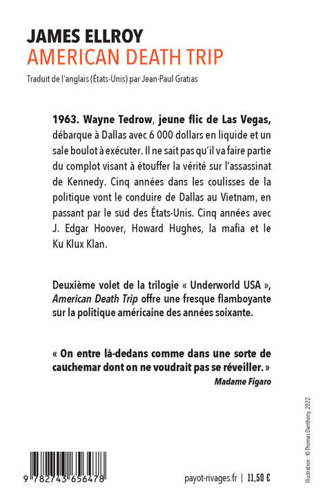 Dallas, novembre 63. Le coeur du rêve américain explose. Un jeune flic arrive de Las Vegas avec 6000 dollars en liquide et un sale boulot à exécuter. Il ne sait pas qu'il va faire partie du complot visant à étouffer la vérité sur l'assassinat de Kennedy. Il s'appelle Wayne Tedrow. Cinq années dans les coulisses de la politique vont le conduire de Dallas au Viêtnam, en passant par le sud des États-Unis. Cinq années avec J. Edgar Hoover, Howard Hughes, la Mafia et le Ku Klux Klan. Voici le second volet de la Trilogie Underworld USA, commencée avec «American Tabloid» (Rivages/Noir n° 282). Le cauchemar américain nourri des coïncidences de l'histoire des années 60 passées au crible par Ellroy. Il y a de la folie chez cet écrivain, de l'obsession dans son écriture.