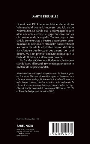 Durant l'été 1983, le jeune héritier des éditions Winterscheid trouve la mort sur une falaise de Noirmoutier. La bande qui l'accompagne se jure alors une amitié éternelle, gage du secret sur les circonstances de la tragédie. Trente-cinq ans plus tard, la communauté d'intérêts s'est muée en communauté de destins. Les "Éternels" ont investi tant les postes clés de la vénérable maison d'édition francfortoise que le coeur des parents de l'ami défunt. Mais un premier cadavre indique que la boîte de Pandore est désormais ouverte... Pia Sander et Oliver von Bodenstein, le tandem star du krimi allemand, reviennent pour percer le mystère de ce pacte mortel.