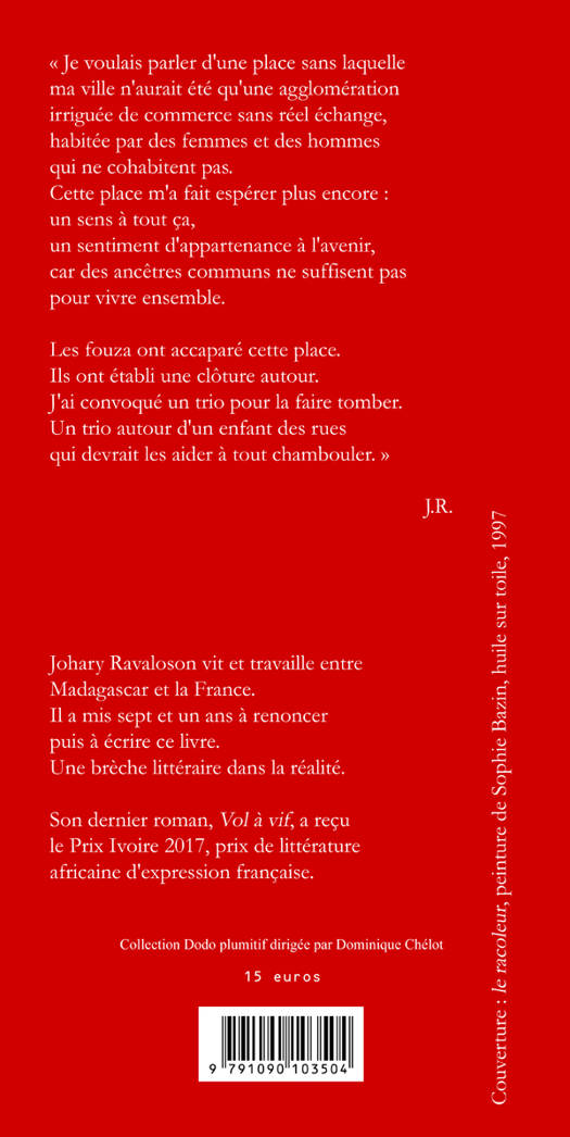 « Antananarivo. Je voulais parler d'une place sans laquelle ma ville n'aurait été qu'une agglomération irriguée de commerce sans réel échange, habitée par des femmes et des hommes qui ne cohabitent pas. La place du 13-Mai m'a fait espérer plus encore : un sens à tout ça, un sentiment d'appartenance à l'avenir, car des ancêtres communs ne suffisent pas pour vivre ensemble. »