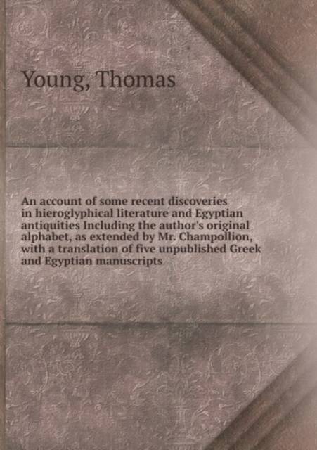 An account of some recent discoveries in hieroglyphical literature and Egyptian antiquities Including the author's original alphabet, as extended by Mr. Champollion, with a translation of five unpublished Greek and Egyptian manuscripts This book, "An account of some recent discoveries in hieroglyphical literature and Egyptian antiquities Including the author's original alphabet, as extended by Mr. Champollion", by Thomas Young, is a replication of a book originally published before 1823. It has been restored by human beings, page by page, so that you may enjoy it in a form as close to the original as possible. This book was created using print-on-demand technology. Thank you for supporting classic literature.