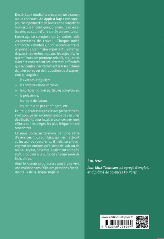 Destiné aux étudiants préparant un examen ou un concours, An Apple a Day a été conçu pour leur permettre de revoir et de consolider leurs acquis linguistiques, grammaire et vocabulaire, au cours d’une année universitaire.