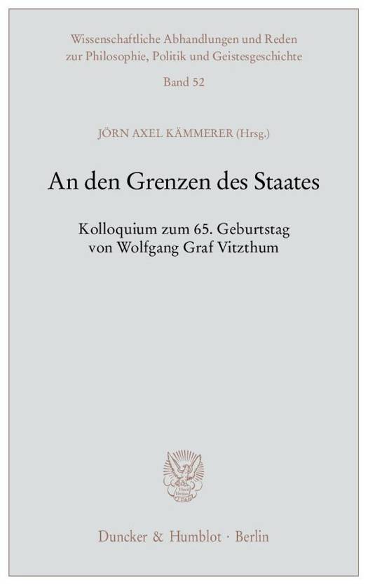 Wolfgang Graf Vitzthum zu Ehren fand im November 2006 in Tübingen ein Kolloquium statt, auf dem die meisten Beiträge in diesem Buch beruhen. Sie gehen Grenzen des Staates in verschiedenen Wirkbereichen - und damit zugleich aus ganz unterschiedlichen Perspektiven - nach. Jörn Axel Kämmerer untersucht, wie sich Privatisierung auf das Verhältnis von staatlicher Regulierung zu privater Selbstregulierung auswirkt. Für den Sport legt Andreas Wax dar, dass private Organisationsprärogative ebenso wie das Europarecht staatlichen Regelungszugriff begrenzen. Die limitierende Funktion der Grundrechte wird bei der Terrorismusbekämpfung, zu der Stefan Talmon Position bezieht, noch deutlicher. Begrenzt ist, wie Bernd Becker belegt, auch steuerstaatliches Handeln, zumal durch das Demokratieprinzip. Daniel Hahn zufolge stutzen systemimmanente Schranken des Staatshandelns auch großzügige "narrative" Staatziele zurecht. Europarechtlichen Grenzen wendet sich Alexander Proelß zu mit einer Analyse der Vorlagepflicht des Bundesverfassungsgerichts gegenüber dem Europäischen Gerichtshof. Den Grenzbereich von Staatssymbolik - Farben, Fahnen, Flaggen - und Kunst lotet Philipp Molsberger aus. Die Möglichkeit eines Wechselspiels zwischen Staat und Dichtung belegt abschließend Wolfgang Graf Vitzthum am historischen Beispiel des Kampfes der Brüder Stauffenberg gegen einen "entgrenzten Staat".